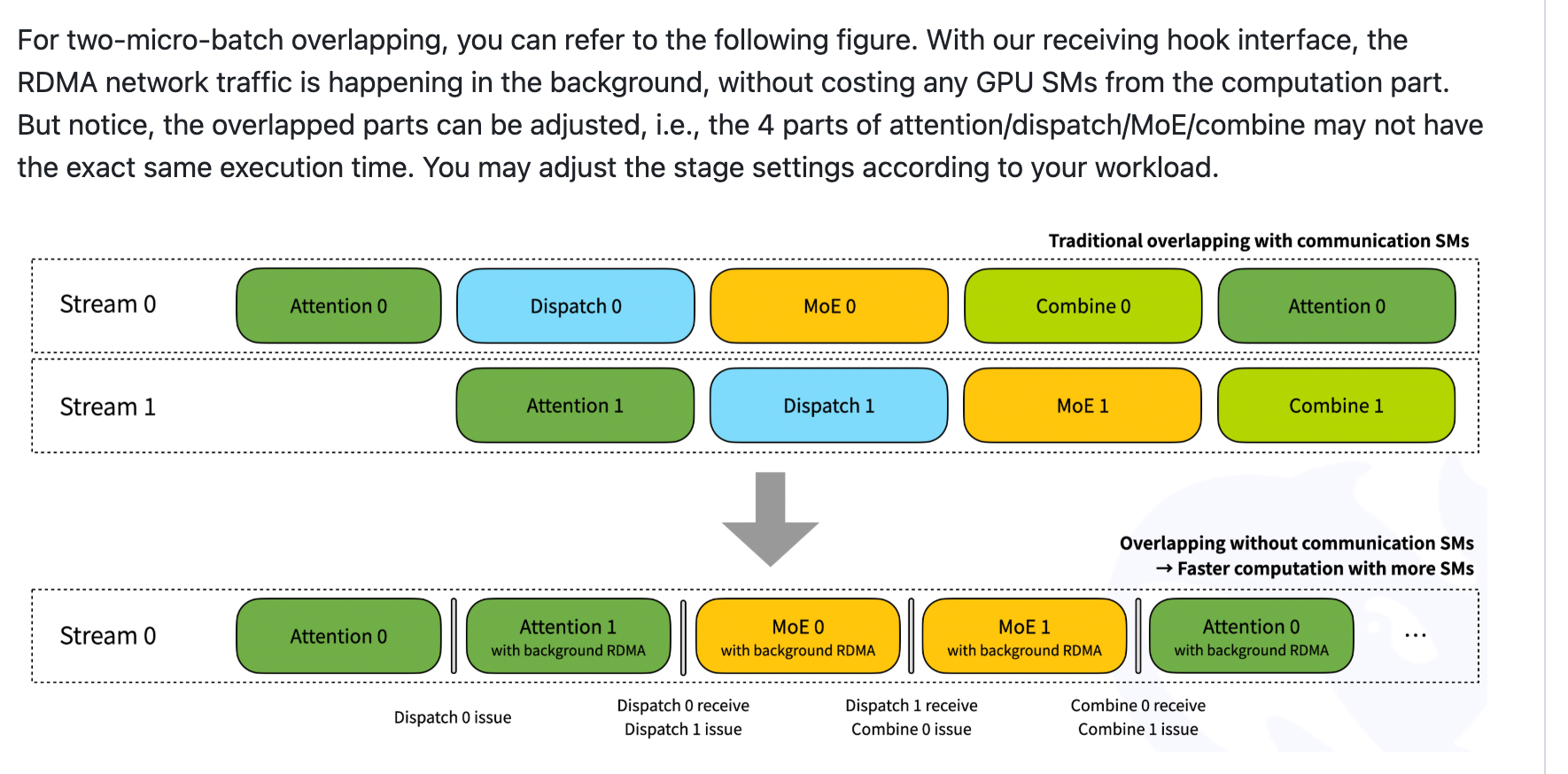 - 而下面这张图里,两个microbatch用的是同一个stream,通信因为使用了RDMA,所以只是作为背景进行的,所以可以被计算时间掩盖掉。